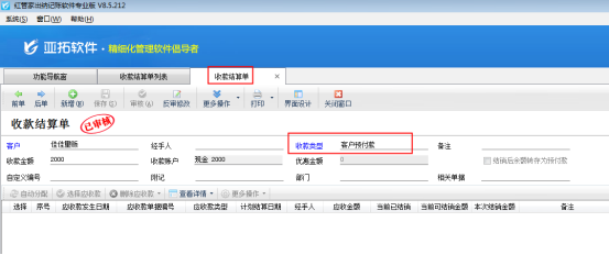在功能導航窗點“往來管理”—》“收款結(jié)算單”即可進入“收款結(jié)算單列表”界面,點擊“新增”按鈕,系統(tǒng)進入“收款結(jié)算單”界面,如圖2所示,選擇客戶名稱,然后“收款類型”選擇為“客戶預付款”,輸入收款金額等信息(下面的明細是不需要填寫的),最后保存、審核單據(jù)即可。