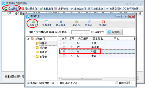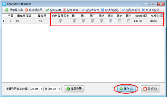 1、設(shè)置操作員登錄限制時,可以批量對多個操作員設(shè)置起始與結(jié)束時間。
