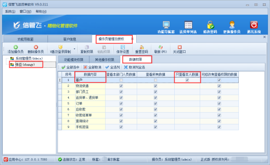 信管飛RMS軟件、信管飛倉(cāng)庫(kù)管理軟件、信管飛送貨單軟件等都支持設(shè)置操作員權(quán)限,以控制操作員登錄軟件所顯示的功能,如公司需要限定操作員僅能查看和選擇自己所屬客戶信息,軟件中可以進(jìn)行控制。