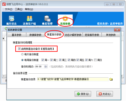 信管飛送貨單軟件信管飛RMS信管飛出納記賬軟件信管飛倉庫管理軟件信管飛票據(jù)軟件都支持設(shè)置賬套自動備份,我們強烈建議啟用自動備份功能,以便賬套出現(xiàn)問題的時候從賬套備份文件中恢復(fù)數(shù)據(jù)。下面我們以信管飛送貨單軟件為例詳細介紹一下如何啟用賬套自動備份功能?