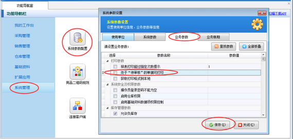 在功能導(dǎo)航窗點擊“系統(tǒng)管理”—》“系統(tǒng)參數(shù)配置”—》“業(yè)務(wù)參數(shù)”,即可進(jìn)入到“業(yè)務(wù)參數(shù)”配置界面,在打印參數(shù)內(nèi)找到“處于‘待審核’的單據(jù)可打印”參數(shù),把這個參數(shù)的勾選去掉,然后保存,如下圖一所示。