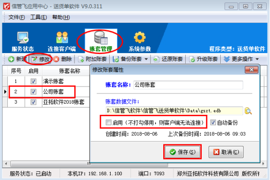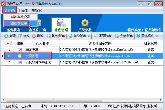 亞拓軟件旗下的信管飛RMS、信管飛倉庫管理軟件信管飛送貨單軟件、信管飛出納記賬軟件、信管飛票據打印軟件等軟件程序安裝后會顯示兩個圖標,一個是應用中心程序(紅色圖標),一個是客戶端程序(藍色圖標)。這些軟件都含有賬套管理功能,在應用中心里面可以建立多個賬套,已使用的帳套如果不再繼續使用,可以停用帳套,停用帳套后,客戶端程序登錄時無法連接該帳套。我們以信管飛送貨單軟件為例演示一下如何停用帳套。