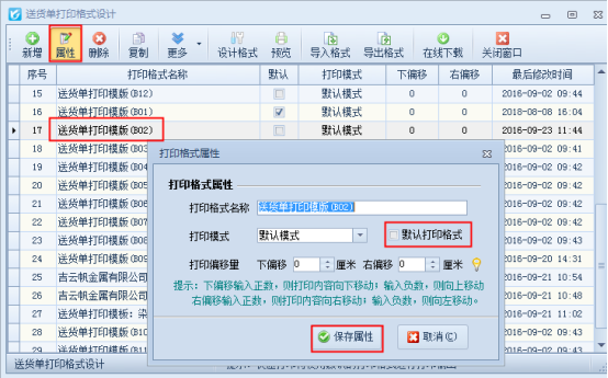 一、在打印格式設計界面工具欄的“屬性”中進行操作。如示例需要設置“送貨單打印模板(B02)”為默認模板,選擇B02模板,點擊工具欄中的“屬性”,彈出的打印格式屬性界面,在“默認打印格式”處打勾,然后保存屬性。如下圖1所示: