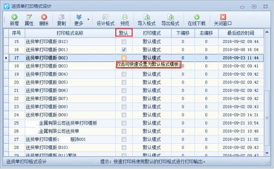 二、在默認框中雙擊快速設置為默認模板,在打印模板后邊的默認選擇框中,雙擊此處可以快速把模板設置為默認模板,如下圖2所示: