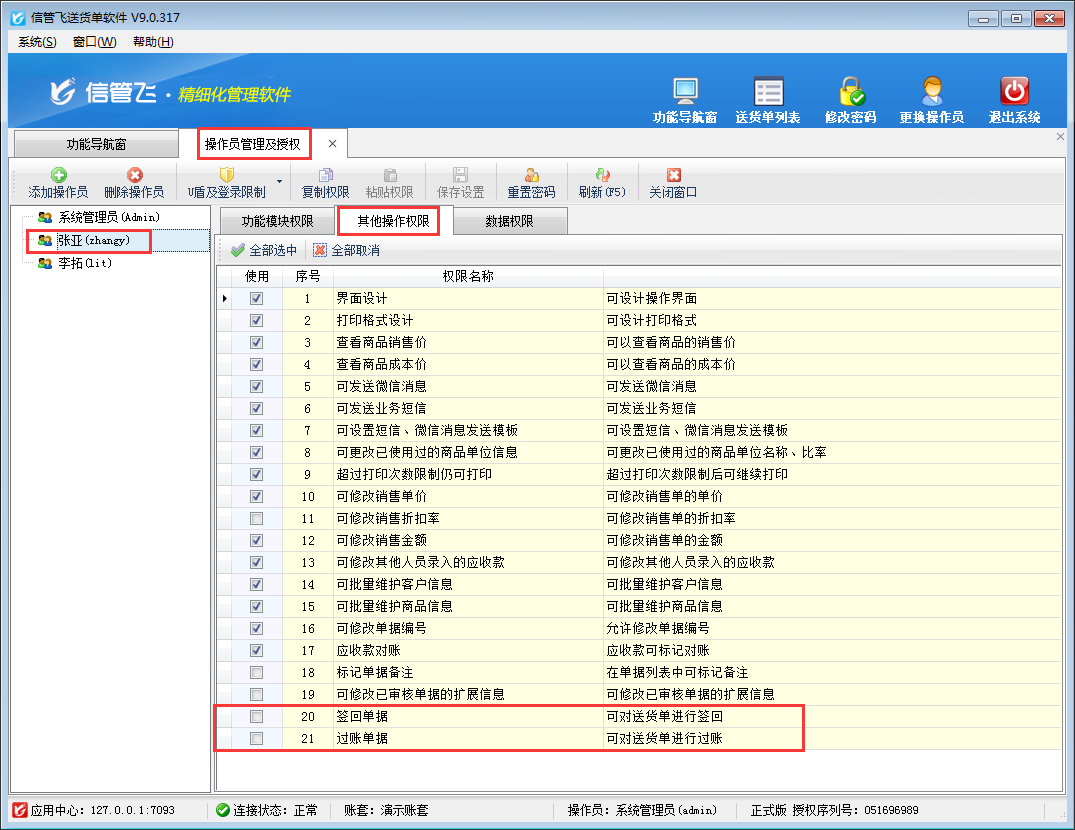 信管飛送貨單軟件通過狀態(tài)控制實現(xiàn)簡單的流程管理(待簽回—》已簽回—》已結(jié)賬),本篇文章我們來介紹一下如何在軟件內(nèi)設(shè)置操作員不可簽回、過賬送貨單?