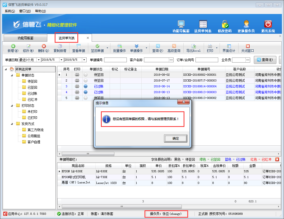 操作員權(quán)限設(shè)置后 ,用操作員“張亞”賬號登錄軟件,在功能導(dǎo)航窗點“業(yè)務(wù)處理”—》“送貨單列表”即可進入“送貨單列表”界面,對送貨單進行簽回、過賬操作時,系統(tǒng)會提示“您沒有簽回(過賬)單據(jù)的權(quán)限,請與系統(tǒng)管理員聯(lián)系!”,如圖2、圖3所示,此操作員無法簽回、過賬送貨單。