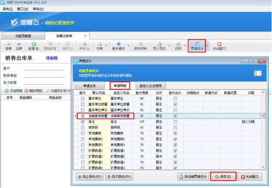 打開軟件的“銷售管理”模塊,新開一個銷售出庫單,點擊“界面設計”選擇“單據明細”數據項,找到“當前庫存數量”數據項并勾選上,保存界面設計。如圖1所示: