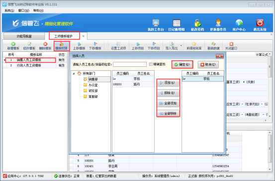 參數(shù)保存設(shè)置完成后,功能導(dǎo)航窗打開“綜合管理”—》“工資模板維護(hù)”界面,選擇工資模板“銷售人員工資模板”,點(diǎn)擊工具欄中的“模板權(quán)限”按鈕,選擇可查看此模板的操作員“李拓”進(jìn)行添加確定。如下圖所示: