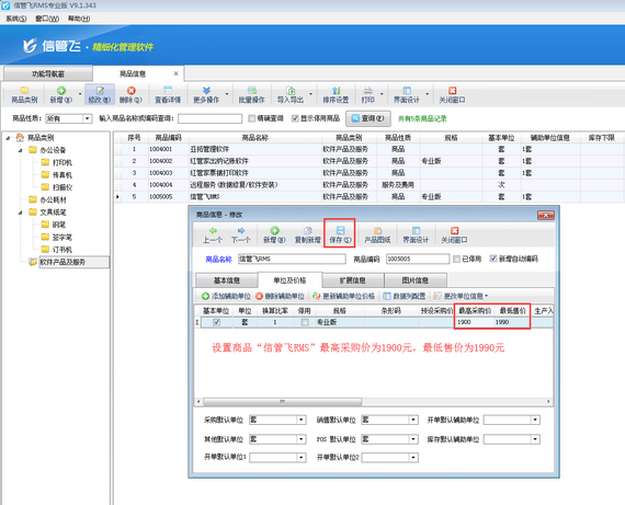 在功能導(dǎo)航窗點擊“基礎(chǔ)資料”—》“商品信息”即可打開“商品信息”界面,然后選擇商品,點擊“修改”按鈕,在“單位及價格”標(biāo)簽頁可設(shè)置商品“最高采購價”及“最低售價”,如下圖一所示,設(shè)置商品“信管飛RMS”最高采購價為1900元,最低售價為1990元。