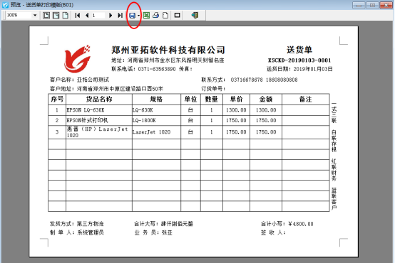 打開一個已經開好的送貨單,點擊“打印”—》“打印預覽”,可以打開送貨單打印預覽界面,如圖1、圖2所示。
