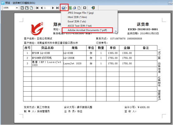 信管飛送貨單軟件、信管飛RMS、信管飛倉庫管理軟件等都支持打印送貨單(銷售單),軟件支持把送貨單預覽界面導出到Excel文件、Html文件、Text文件及jpg、pdf等電子檔格式,方便用戶導出送貨單的電子檔給客戶看,方便客戶可以隨時查看送貨單內容。下面我們以信管飛送貨單軟件為例講一下如何把送貨單預覽界面導出為pdf格式。