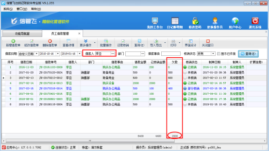 信管飛出納記賬軟件專業版包括員工借款管理功能,在員工借款管理中可以查看員工欠款信息,如下圖所示,以員工“李亞”為例,員工欠款是2000元。
