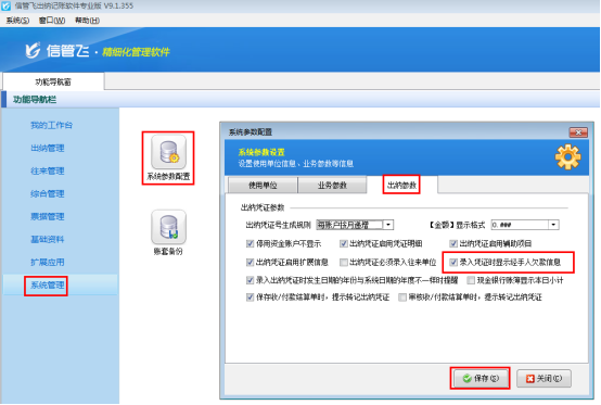 在功能導航窗點擊“系統管理”—》“系統參數配置”—》“出納參數”,即可進入到“出納參數”配置界面,打鉤啟用“錄入憑證時顯示經手人欠款信息”參數,然后保存,如下圖所示: