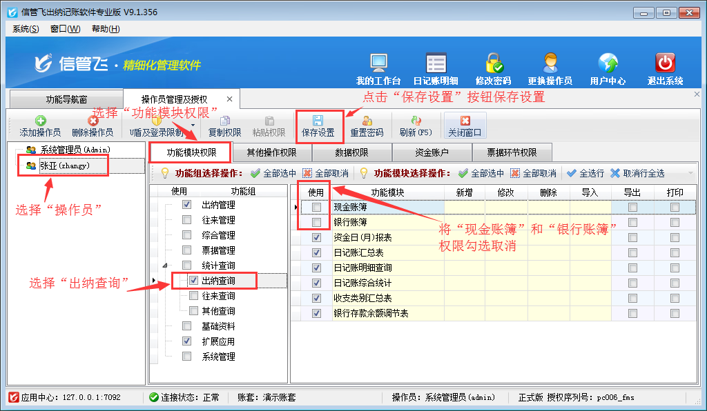 登錄軟件,在功能導(dǎo)航窗點(diǎn)擊“系統(tǒng)管理”—》“操作員及授權(quán)”,進(jìn)入“操作員管理及授權(quán)”界面,選擇操作員“張亞”,在其右側(cè)的功能模塊權(quán)限內(nèi)選擇“出納查詢”模塊,將現(xiàn)金賬簿和銀行賬簿的“使用”權(quán)限勾選取消,然后保存設(shè)置,如下圖所示。
