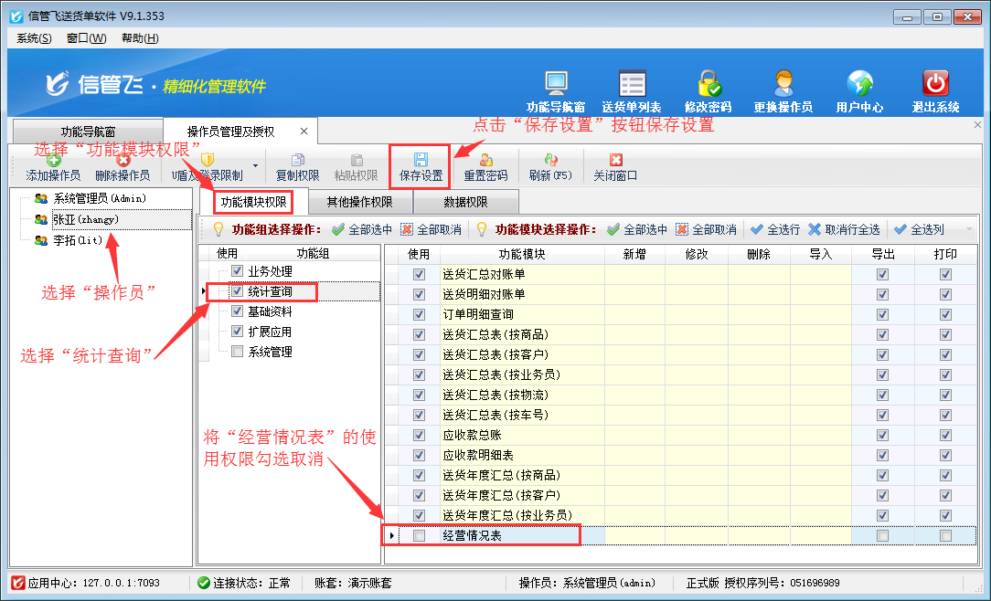 登錄軟件,在功能導航窗點擊“系統管理”—》“操作員及授權”,進入“操作員管理及授權”界面,選擇操作員“張亞”,在其右側的功能模塊權限內選擇“統計查詢”,將經營情況表的“使用”權限勾選取消,然后保存設置,如下圖所示。