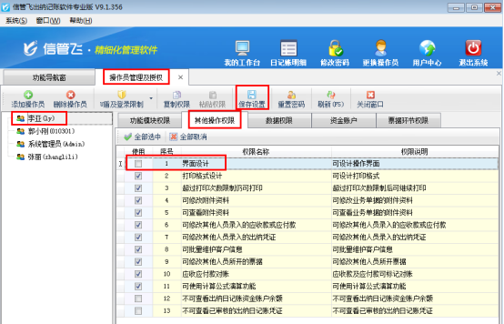 在功能導航窗點“系統管理”—》“操作員及授權”即可進入“操作員管理及授權”界面,選擇操作員賬號,在“其他操作權限”界面將“界面設計”權限的打鉤取消,如圖1所示,設置操作員賬號“李亞”不可進行界面設計,設置后點擊“保存設置”。