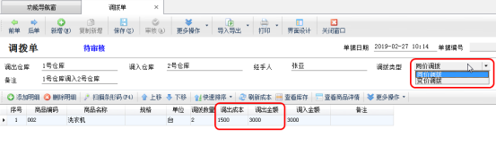 ②選擇調撥類型后,下面的單據明細會自動切換需要輸入的數據項(調入單價、調入金額、調撥差額)。