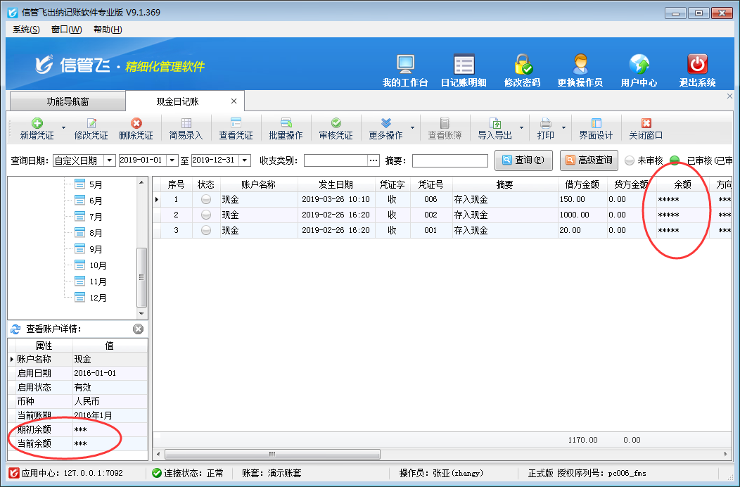 設置完成之后,我們使用操作員“張亞”登陸軟件并查看現金及銀行賬戶余額,可以看到賬戶余額已用“***”代替,操作員不可查看,如下圖二、圖三所示。