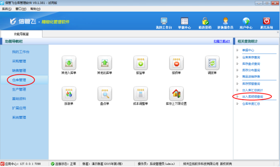 在功能導航窗點“倉庫管理”—》“相關查詢統計”—》“出入庫明細查詢”,即可進入商品出入庫明細查詢界面,如下圖所示: