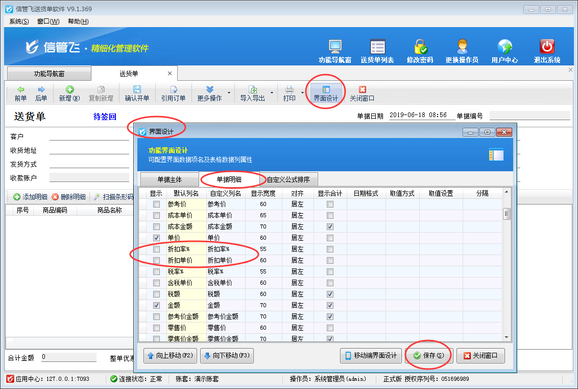 在送貨單界面工具欄點(diǎn)擊“界面設(shè)計(jì)”按鈕,打開界面設(shè)計(jì)窗口,選擇單據(jù)明細(xì),找到“折扣率%”和“折扣單價(jià)”數(shù)據(jù)項(xiàng),將“顯示”勾選取消并保存配置即可。