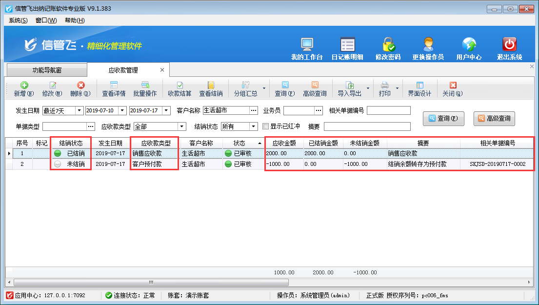 收款結(jié)算單單據(jù)審核之后,會更新應(yīng)收款的結(jié)銷情況,在應(yīng)收款管理內(nèi)可以查看,如下圖所示。銷售應(yīng)收款2000元已結(jié)銷,未結(jié)銷金額為0。另外系統(tǒng)自動生成了一個應(yīng)收款類型為“客戶預(yù)付款”的應(yīng)收款記錄,應(yīng)收金額為-1000(預(yù)付款金額顯示為負(fù)數(shù)),摘要為“結(jié)銷余額轉(zhuǎn)存為預(yù)付款”,相關(guān)單據(jù)編號中顯示為轉(zhuǎn)存預(yù)付款的收款結(jié)算單單據(jù)編號。