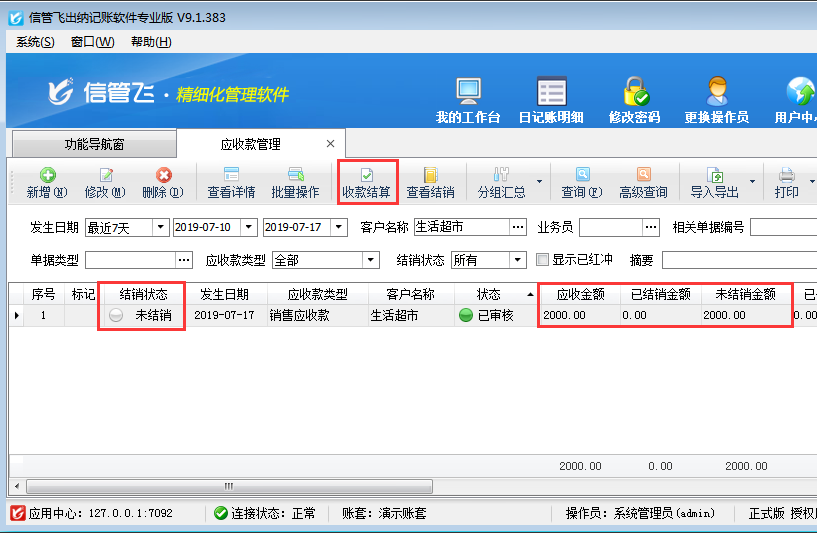 在應(yīng)收款管理界面點擊“收款結(jié)算”按鈕可以打開收款結(jié)算單對應(yīng)收款進行收款結(jié)算,單據(jù)主體“收款金額”錄入3000元,單據(jù)明細(xì)中“本次結(jié)銷金額”錄入2000元,保存收款結(jié)算單時系統(tǒng)提示“收款金額3000+優(yōu)惠金額0大于本次結(jié)銷金額合計2000!........”無法保存成功!