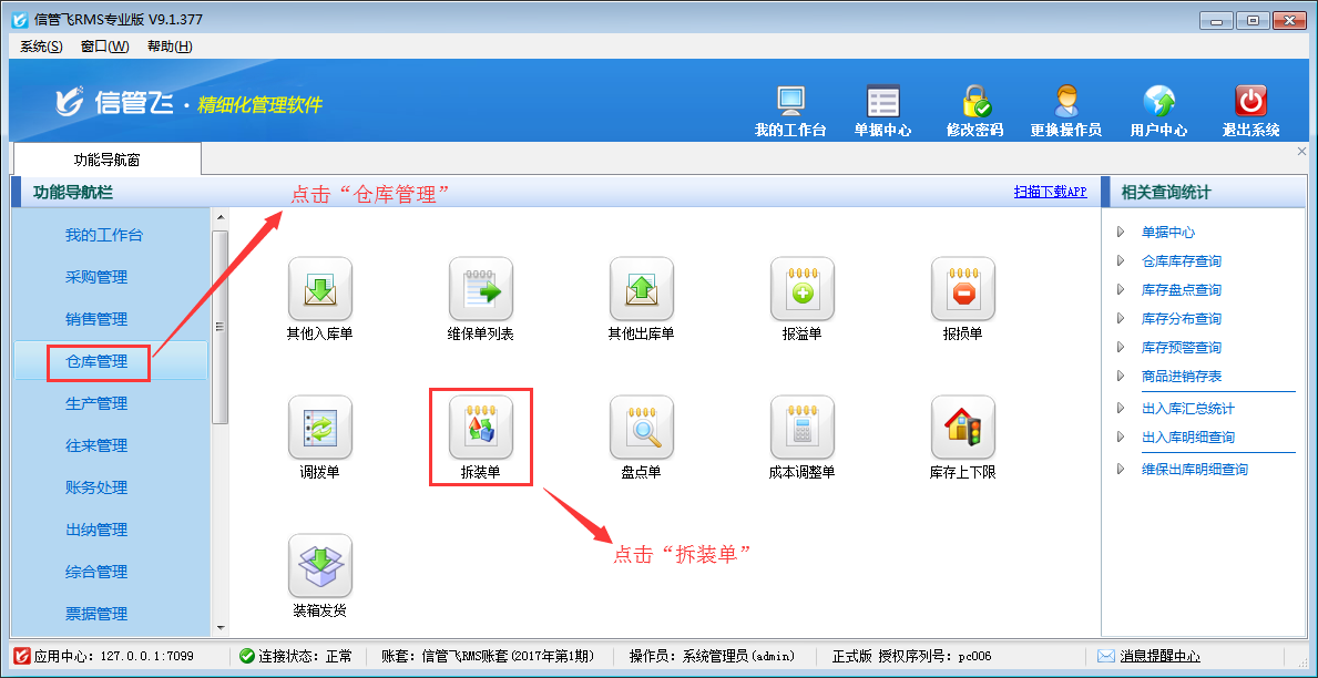 信管飛RMS信管飛倉庫管理軟件都支持拆裝單,拆裝單用于處理進貨時為組件、配件、原料等,但銷售時卻是成套銷售的,比如電腦經銷商,采購的是電腦配件,但實際銷售的是整機。也有購入的是整機,但銷售的時候是按單個配件進行銷售的情況,也可以使用拆裝單進行處理。