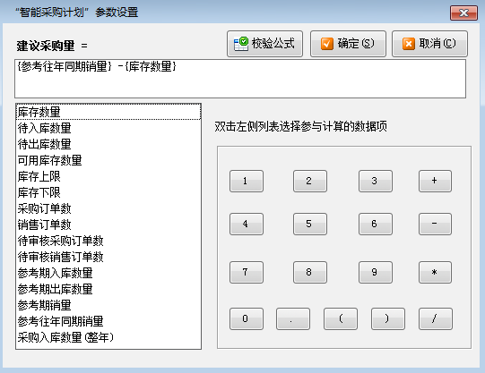 (1)參數設置:可以設置“建議采購量”的運算公式,軟件將根據您設計的公式計算出建議數量。