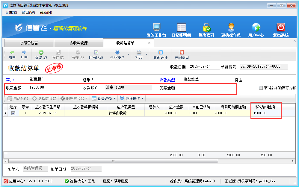 在應(yīng)收款管理界面點(diǎn)擊“收款結(jié)算”按鈕可以打開收款結(jié)算單對應(yīng)收款進(jìn)行收款結(jié)算,如下圖所示,在收款結(jié)算單單據(jù)主體選擇收款賬戶后錄入“收款金額”1200元,單據(jù)明細(xì)中“本次結(jié)銷金額”錄入1200元,保存并審核收款結(jié)算單即可。