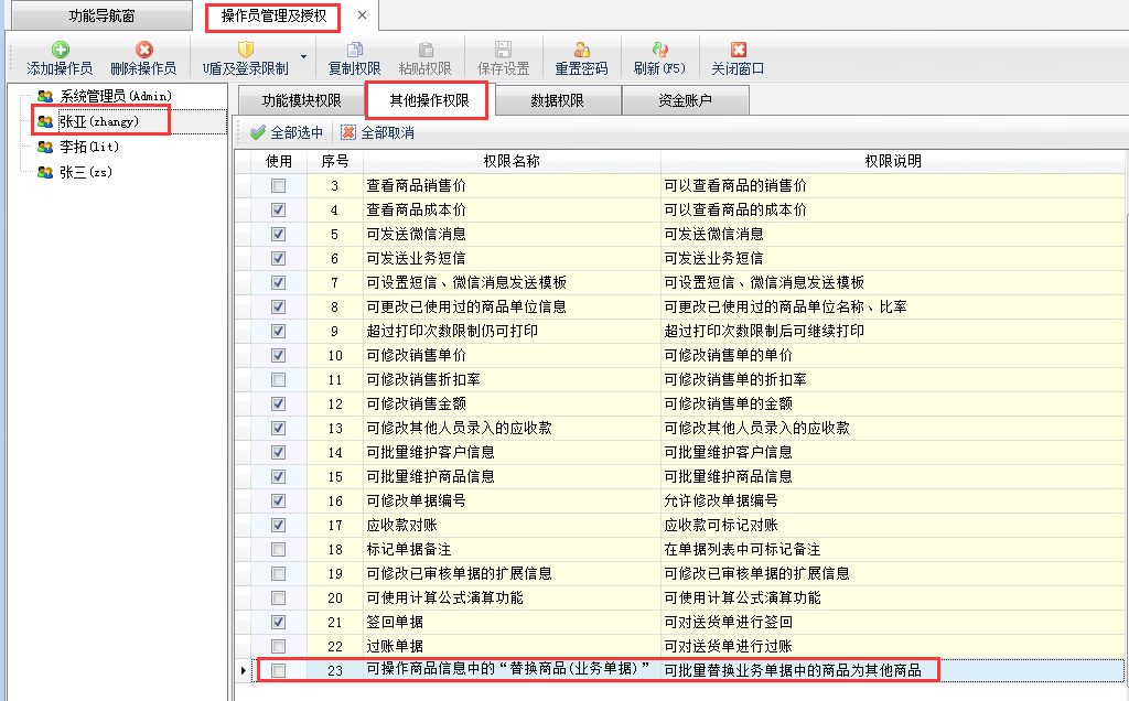 本文以信管飛送貨單軟件為例,在功能導航窗點擊“系統(tǒng)管理”—》“操作員及授權”進入操作員管理及授權界面,如下圖所示:選擇操作員“張亞”,在右側權限設置界面,選擇“其他操作權限”,把權限“可操作商品信息中的‘替換商品(業(yè)務單據)’功能”取消勾選,然后保存配置。