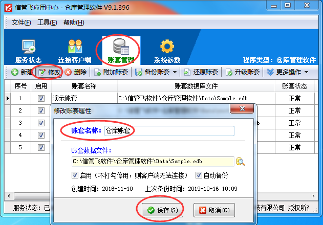 以“信管飛倉庫管理軟件”為例,示范下如何修改賬套的名稱。打開紅色的應(yīng)用中心程序(應(yīng)用中心運(yùn)行后桌面右下角會顯示相應(yīng)的圖標(biāo),點(diǎn)擊即可打開應(yīng)用中心主界面),在賬套管理界面,點(diǎn)擊賬套后選擇工具欄中的“修改”按鈕,彈出“修改賬套屬性”界面,把“演示賬套”修改為“倉庫賬套”,然后點(diǎn)擊“保存”按鈕,如下圖所示: