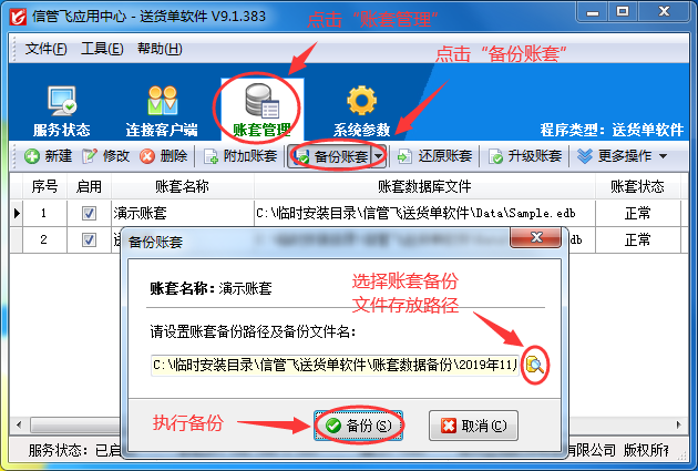 一、在信管飛送貨單軟件應用中心程序中執行賬套備份。