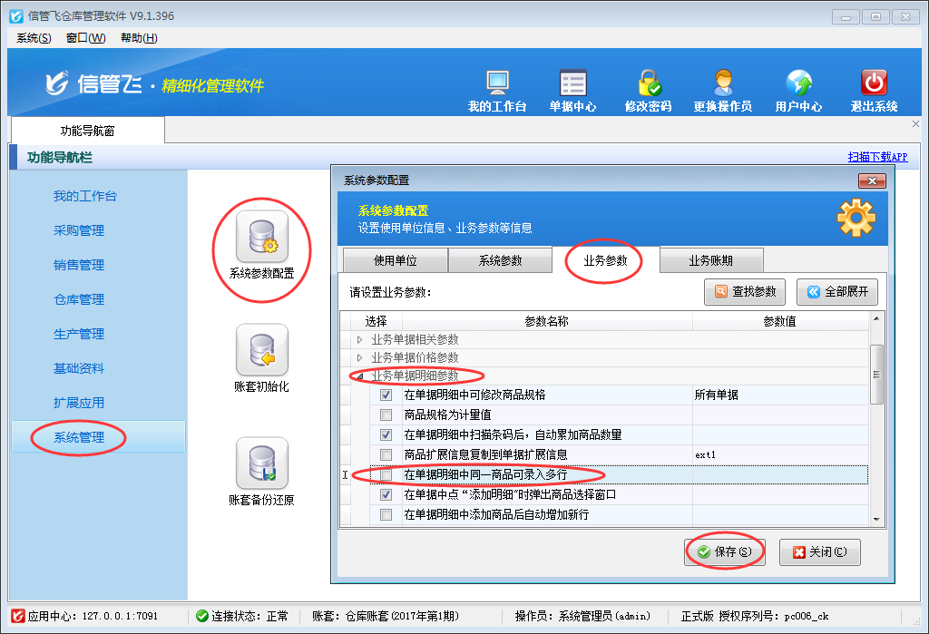 在功能導(dǎo)航窗點(diǎn)擊“系統(tǒng)管理”—》“系統(tǒng)參數(shù)配置”—》“業(yè)務(wù)參數(shù)”,即可進(jìn)入到“業(yè)務(wù)參數(shù)”配置界面,在業(yè)務(wù)單據(jù)明細(xì)參數(shù)內(nèi)找到“在單據(jù)明細(xì)中同一商品可錄入多行”參數(shù),把這個參數(shù)的勾選去掉,然后保存,如下圖所示。