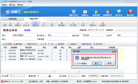 信管飛RMS、信管飛倉庫管理軟件、信管飛送貨單軟件等在業(yè)務(wù)單據(jù)保存時(shí)如果商品單價(jià)為0,系統(tǒng)會(huì)彈出提示信息,是否需要繼續(xù)保存,如下圖1所示,這樣以免用戶在添加商品明細(xì)時(shí)忘了填寫單價(jià),好及時(shí)錄入,但是有一部分用戶在開單據(jù)時(shí)只需要填寫商品數(shù)量,不需要填寫單價(jià),該怎么設(shè)置系統(tǒng)才能不彈出以下提示信息呢?本篇文章以信管飛倉庫管理軟件為例介紹一下如何設(shè)置出庫單保存時(shí)商品單價(jià)為0系統(tǒng)不彈出提示信息?