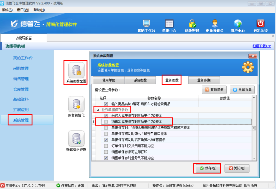 在功能導(dǎo)航窗點(diǎn)擊“系統(tǒng)管理”—》“系統(tǒng)參數(shù)配置”—》“業(yè)務(wù)參數(shù)”,即可進(jìn)入到“業(yè)務(wù)參數(shù)”配置界面,在業(yè)務(wù)單據(jù)保存參數(shù)內(nèi)找到“銷售出庫單保存時(shí)商品單價(jià)為0提示”參數(shù),把這個(gè)參數(shù)的勾選去掉,然后保存設(shè)置,如下圖2所示。