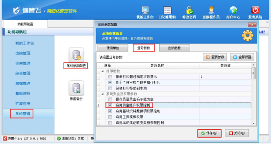 在功能導航窗選擇“系統(tǒng)管理”—》“系統(tǒng)參數(shù)配置”—》“業(yè)務(wù)參數(shù)”進入業(yè)務(wù)參數(shù)配置界面,在系統(tǒng)安全及權(quán)限設(shè)置中勾選“啟用資金賬戶權(quán)限控制”參數(shù),如下圖所示: