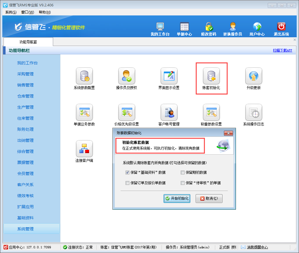 執行賬套初始化操作后,會刪除賬套內相應的數據,因此務必提前做好備份,謹慎操作!為了避免操作員誤操作,導致數據丟失,軟件內支持設置操作員不可進行賬套初始化操作,下面以信管飛RMS為例來演示一下具體的操作步驟。