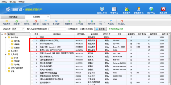以圖1為例,要把第2行至第5行商品類別是“商品類別”的4條記錄的商品類別改為“打印機”。首先點擊第2行記錄,然后按下Shift鍵不松手時鼠標點擊第5行記錄,這樣就可以同時快速選中第2行至第5行這4條記錄,選中多條記錄后,再按住鼠標左鍵不松手,移動到商品類別“打印機”處,此時系統會提示“是否要將當前選擇4個商品的類別設置為【打印機】?”,點“是”按鈕即可,如圖2所示。