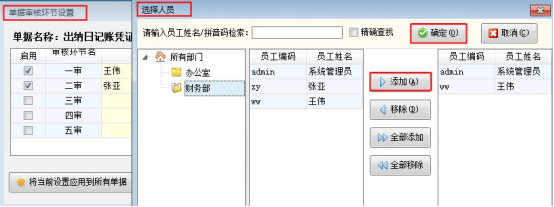 二、多級審核功能的配置在功能導航窗,點擊“系統管理”—》“系統參數配置”—》“出納參數”中勾選啟用“出納憑證啟用多級審核”,點擊右邊文本框的“...”處,進入單據審核環節設置,如下圖所示,對出納日記賬憑證進行了二級審核的設置,一審操作員是“王偉”,二審操作員是“張亞”。