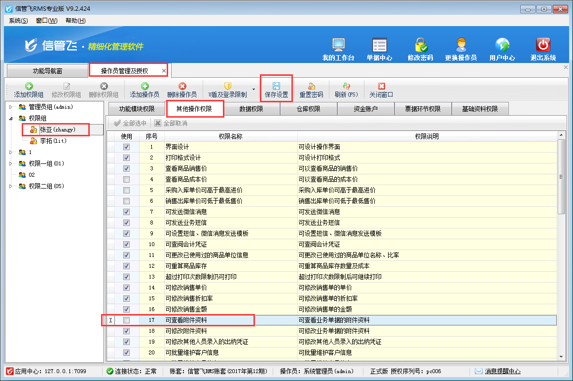 在功能導(dǎo)航窗點(diǎn)擊“系統(tǒng)管理”—》“操作員及授權(quán)”打開操作員管理及授權(quán)界面,選擇操作員“張亞”,在“其他操作權(quán)限”中把權(quán)限“可查看附件資料”勾選取消,然后點(diǎn)擊“保存設(shè)置”按鈕保存權(quán)限設(shè)置,如下圖所示: