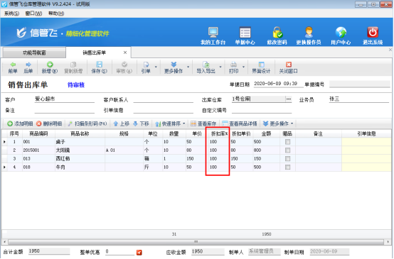 信管飛送貨單軟件、信管飛倉庫管理軟件、信管飛RMS開單時(shí),當(dāng)商品存在打折情況時(shí),支持錄入商品的折扣率。當(dāng)商品明細(xì)的內(nèi)容比較多時(shí),為了快速開單,提高效率,可以批量更新單據(jù)明細(xì)中的折扣率。下面我們以信管飛倉庫管理軟件為例詳細(xì)介紹下如何批量修改商品折扣率。