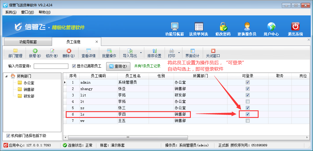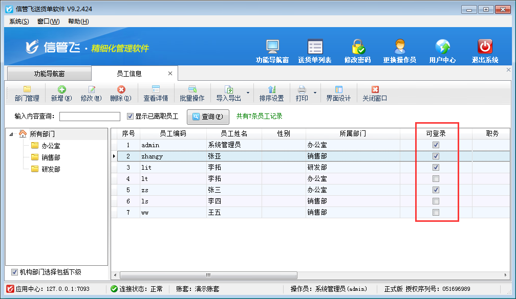 亞拓軟件旗下信管飛系列軟件(精細(xì)化管理軟件、出納記賬軟件、送貨單打印軟件、倉(cāng)庫(kù)管理軟件等)都支持設(shè)置員工賬號(hào)可登錄軟件,但是部分用戶在設(shè)置員工賬號(hào)可登錄軟件時(shí),發(fā)現(xiàn)“可登錄”是無(wú)法勾選的,如下圖所示,本文以送貨單軟件為例介紹一下如何設(shè)置員工賬號(hào)可登錄軟件?