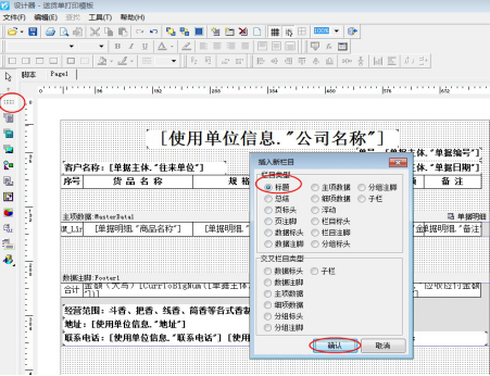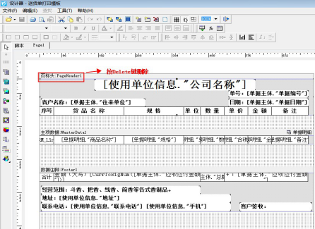 打開已開送貨單界面,在工具欄點擊打印—》打印格式設計進入打印格式設計界面,選擇模板點擊“設計格式”,進入模板設計器界面,在模板設計器中,單擊頁標頭,按Delete鍵刪除頁標頭,然后左邊工具欄點擊“插入邊框”,在表頭處插入“標題”,然后往下拖動,覆蓋所有表頭內容,保存模板即可。如下圖所示: