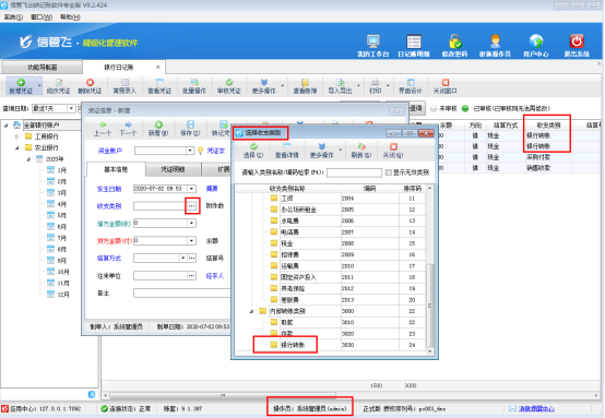 系統(tǒng)管理員登錄軟件后可以看到“銀行轉(zhuǎn)賬”相關(guān)的出納憑證,如圖3所示。而使用操作員“張亞”登錄軟件,日記賬列表內(nèi)看不到收支類別為“銀行轉(zhuǎn)賬”的憑證記錄,新增憑證界面在選擇收支類別窗口也無法選擇到“銀行轉(zhuǎn)賬”,如下圖4所示: