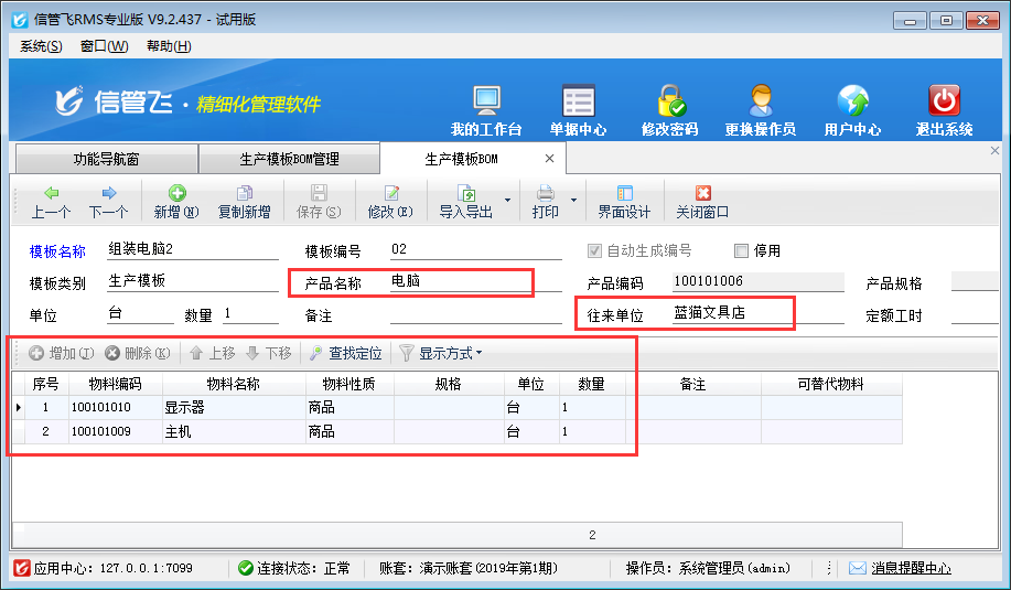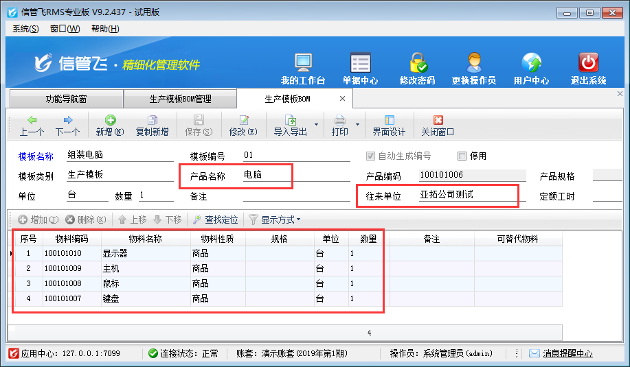 參數(shù)配置完成之后,打開生產(chǎn)管理模塊,重新新增生產(chǎn)模板BOM表時(shí),即可選擇往來單位,如下圖所示,在給“亞拓公司測(cè)試”、“藍(lán)貓文具店”兩家客戶生產(chǎn)同樣的產(chǎn)品“電腦”時(shí)設(shè)置的不同的生產(chǎn)模板,所需的原材料不同。