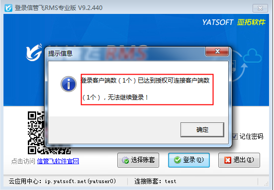 信管飛所有軟件都支持云賬套服務(wù)模式,數(shù)據(jù)存在云服務(wù)上,本地只要有網(wǎng)絡(luò)就可以登錄客戶端程序連接數(shù)據(jù)使用,云賬套模式是按用戶數(shù)進行收費使用的,經(jīng)常有客戶反映登錄其它電腦客戶端的時候提示“登錄客戶端數(shù)已達到授權(quán)可連接用戶數(shù),無法繼續(xù)登錄”,如下圖所示。為了可繼續(xù)使用,軟件支持可直接操作“斷開連接”,本文以信管飛RMS軟件為例進行示范。