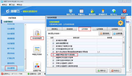 在功能導航窗點擊“系統管理”—》“系統參數配置”—》“業務參數”,即可進入到“業務參數”配置界面,在業務單據相關參數內打鉤啟用“銷售開單顯示客戶欠款信息”參數,然后保存,如下圖所示: