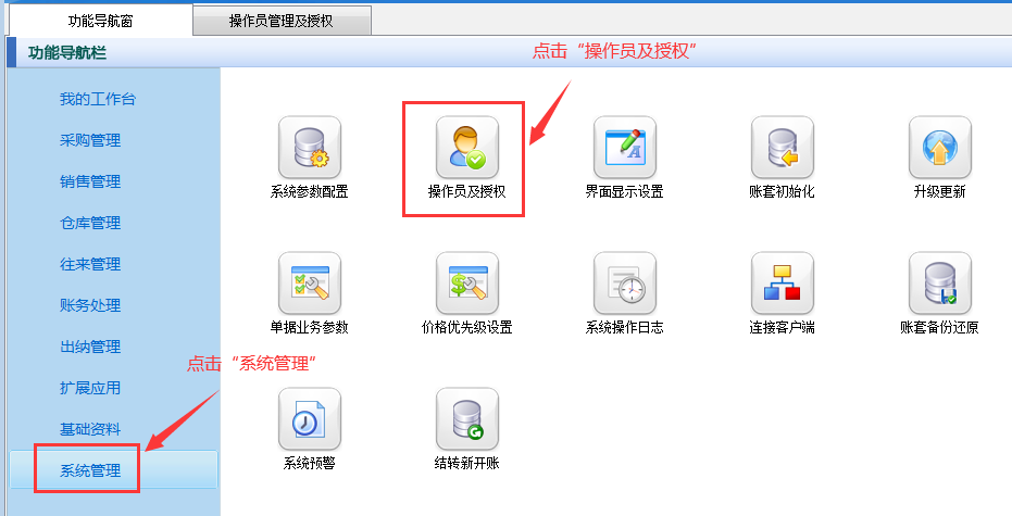 在功能導(dǎo)航窗點(diǎn)擊“系統(tǒng)管理”—》“操作員及授權(quán)”,進(jìn)入“操作員管理及授權(quán)”界面,選擇操作員“張亞”,在其右側(cè)的功能模塊權(quán)限內(nèi)選擇“擴(kuò)展應(yīng)用”模塊,將出入庫(kù)掃碼的“使用”權(quán)限勾選取消,然后保存設(shè)置,如下圖所示。