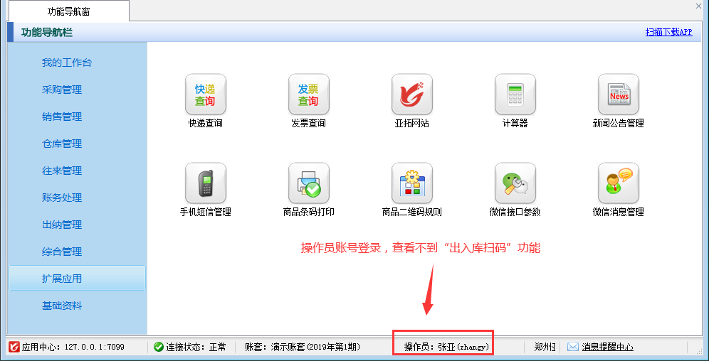 操作員權(quán)限設(shè)置完成后,使用操作員“張亞”登錄軟件,打開擴(kuò)展應(yīng)用模塊,可以看到操作員已無法查看到“出入庫(kù)掃碼”功能,如下圖所示。