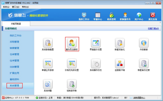 信管飛RMS軟件、信管飛倉庫管理軟件、信管飛出納記賬軟件、信管飛送貨單軟件等都支持設置多個操作員登錄軟件,本文以信管飛RMS軟件標準版為例演示一下如何新增操作員賬號并設置操作員權限?